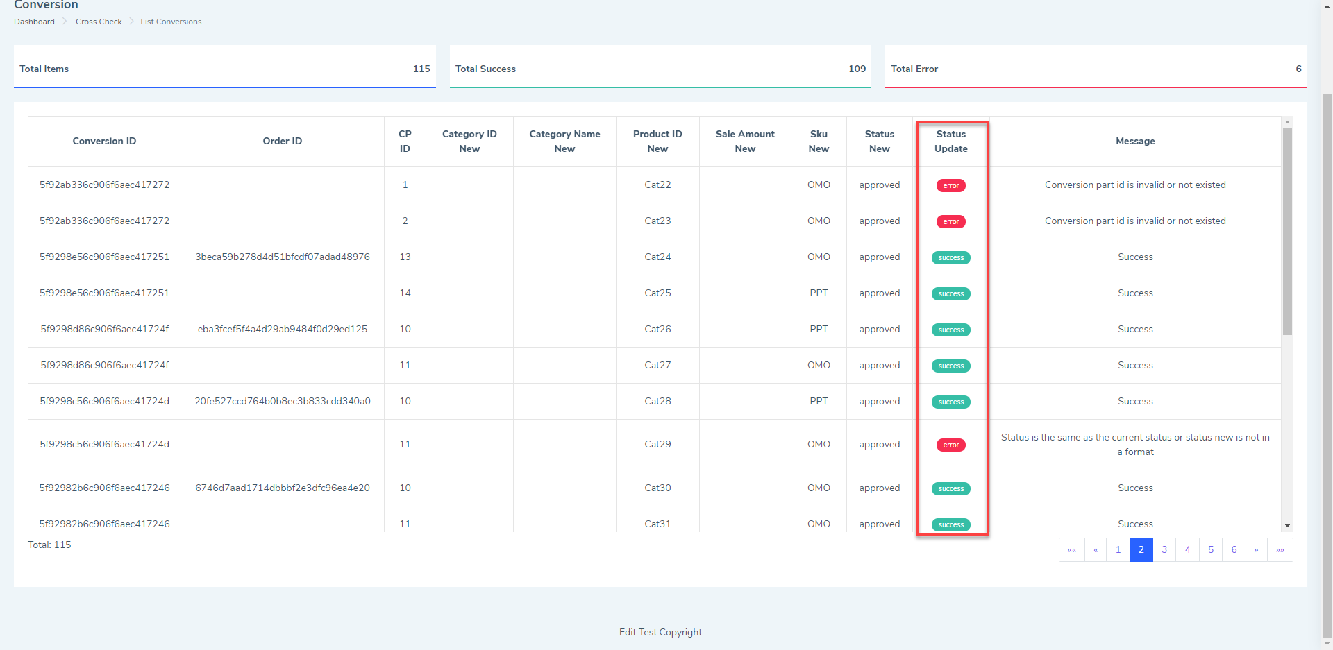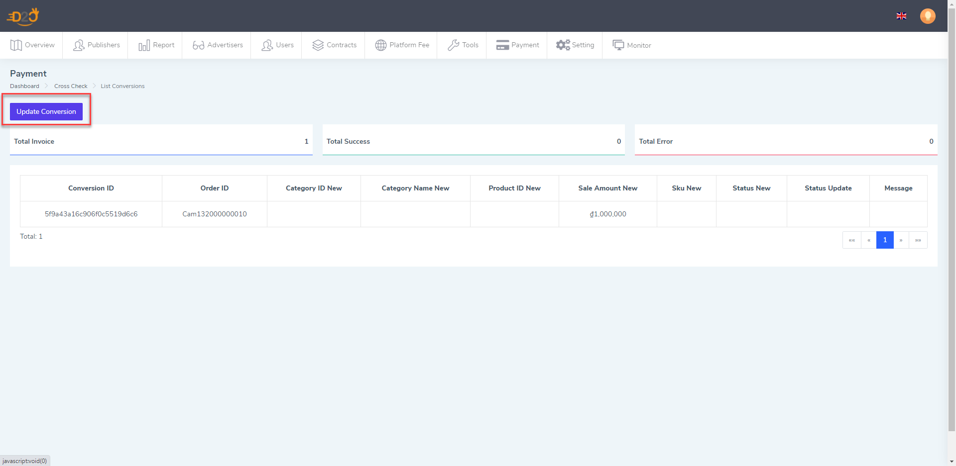 Trường hợp muốn update status của conversion thì chỉ cần điền conversion ID và trạng thái muốn thay đổi