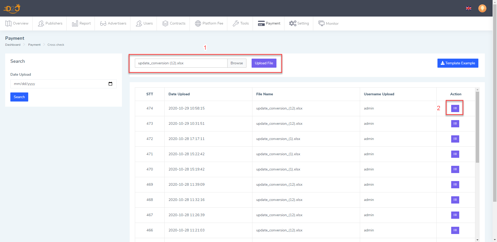 Trên trang hiển thị danh sách những file từng được upload lên, click icon ở cột action để xem chi tiết file up lên