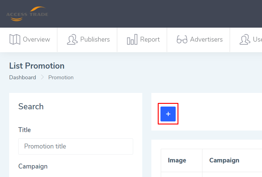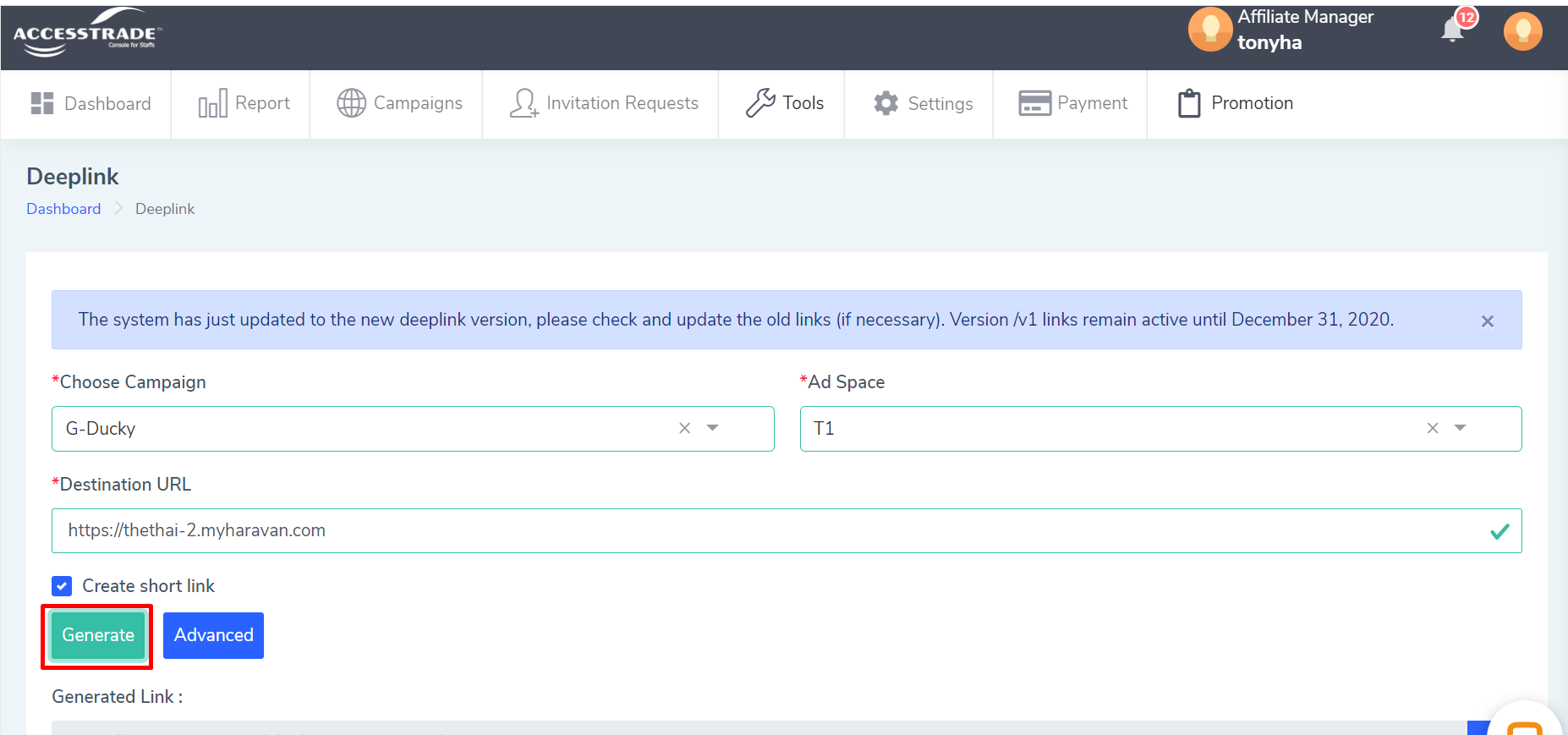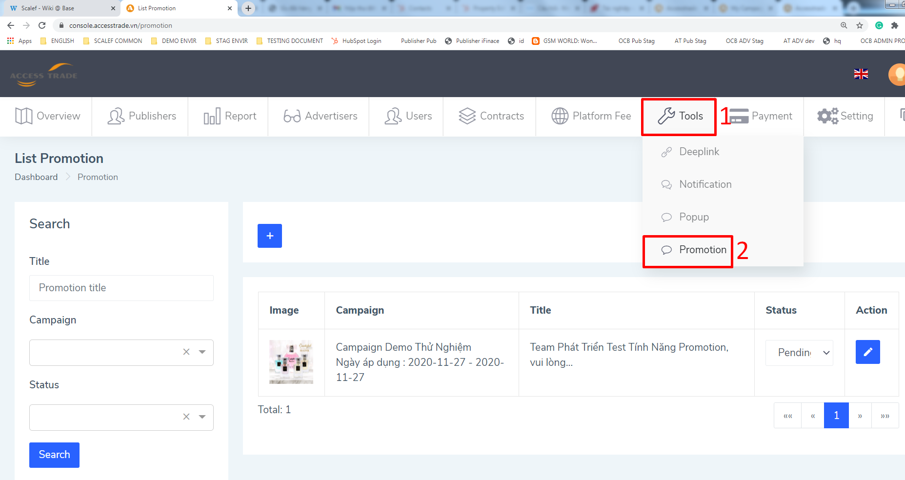 B2: Vào menu (1) "Promotion" -> Click button (2) "Tạo link phân phối" để tạo tới trang tạo link